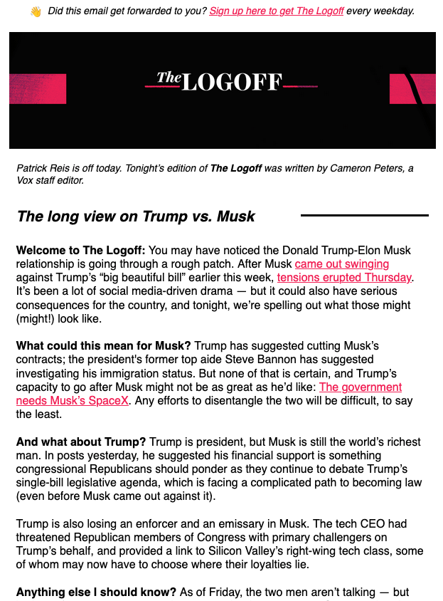 Another example: Vox's The Logoff newsletter started up after Trump took office. It's a short daily (weekdays, that is) that picks up a big Trump related issue of the day (no shortage of those) and gives a four to five paragraph explainer. It's not policy heavy. It's not full of visuals and graphs. It doesn't try to drive you to the Vox site. It reads like your smart DC friend breaking things down for you.